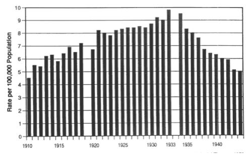 One claim is that certain indicators of alcoholism decreased. A source for this is Jack Blocker 2006. He reports a decline of ethanol consumption to 1.2 gallons per year by the early 1930s, which is less than half of pre-1910 levels, along with reductions in admissions for alcholic psychosis and lower rates of liver cirrhosisxi. Consumption levels according to his report did rise back to about 70% of pre-Prohibition levels by 1930, but did not return to pre-Prohibition levels until the 1970s. An issue with this data is that much of it is self-reported, and under prohibition lawbreaking respondents are significantly less likely to be truthful even when anonymous. We saw something similar during the 2016 election where the “shy Trump supporter” effect grossly depressed polling in favor of Clinton. Even seemingly more concrete data like psychosis admissions and cirrhosis are likely to suffer from this effect due to the desire to avoid stigmatizing an already-suffering patient. The cirrhosis rates specifically may not directly correlate with consumption levels, as they may be influenced by changes in drinking habits, improved quality of medical reporting and demographic changes such as immigrationxii. Furthermore, the death rate from alcoholism was lowest not during prohibition but during World War I. It was during prohibition that this rate returned to pre-war levels in the US, while in countries without such as the UK, Ireland, and Denmark, death from alcoholism continued to fall.
